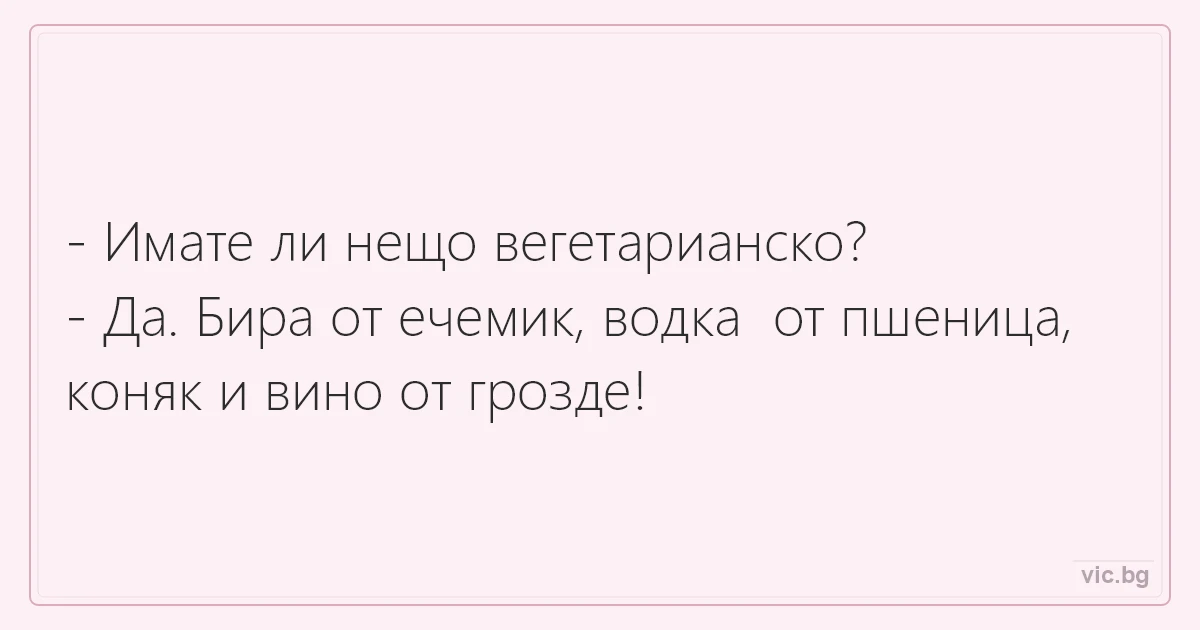 - Имате ли нещо вегетарианско? - Да. Бира от ечемик, водка от пшеница, коняк и вино от грозде!