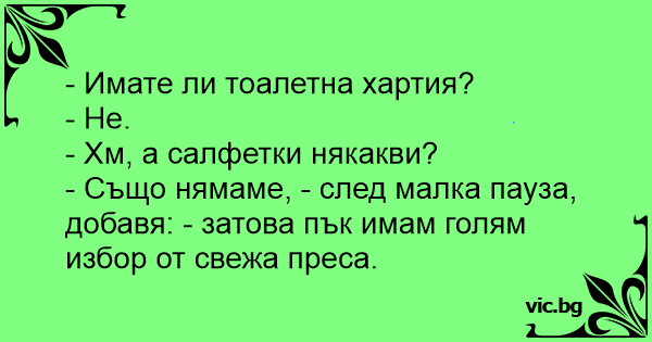 - Също нямаме, - след малка пауза, добавя: - затова пък имам голям избор от свежа преса.