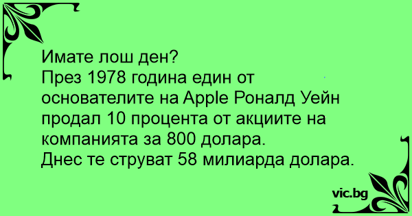 През 1978 година един от основателите на Apple Роналд Уейн продал 10 процента от акциите на компанията за 800 долара.