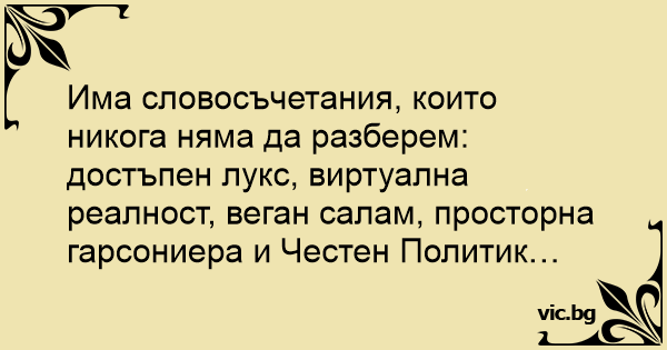 Има словосъчетания, които никога няма да разберем: достъпен лукс, виртуална реалност, beгaн салам, просторна гарсониера и Честен Политик…