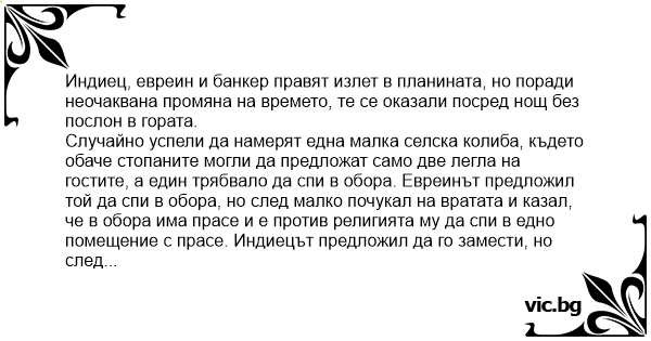 Случайно успели да намерят една малка селска колиба, където обаче стопаните могли да предложат само две легла на гостите, а един трябвало да спи в обора. Евреинът предложил той да спи в обора, но след малко почукал на вратата и казал, че в обора има прасе и е против религията му да спи в едно помещение с прасе. Индиецът предложил да го замести, но след малко и той почукал обратно на вратата, защото в обора имало крава и това било против религията му. Банкерът предложил да отиде той в обора. След малко обаче на вратата се почукало.