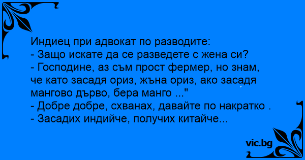 Přijde Ind na úřad v hlavním městě a povídá: „Sáhibe, já se chci rozvést.” Úředník se na něj přísně podívá a odvětí: „To není jen tak, musíš k tomu mít nějaký důvod.” Ind se zamyslí a říká:...