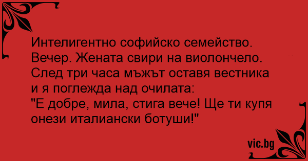 Интелигентно софийско семейство. Вечер. Жената свири на виолончело. След три часа мъжът оставя вестника и я поглежда над очилата: