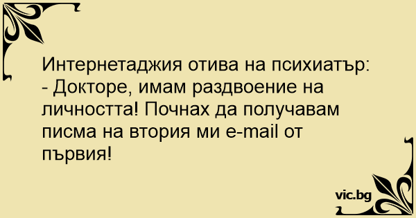 - Докторе, имам раздвоение на личността! Почнах да получавам писма на втория ми e-mail от първия!