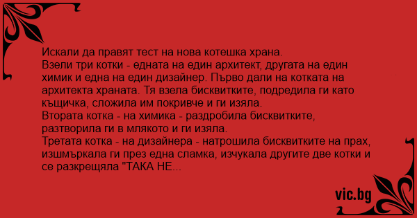 Взели три котки - едната на един архитект, другата на един химик и една на един дизайнер. Първо дали на котката на архитекта храната. Тя взела бисквитките, подредила ги като къщичка, сложила им покривче и ги изяла.
