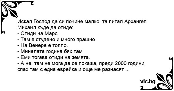 Jumala päätti pitää lomaa, ja suunniteli Pyhän Pietarin kanssa lomakohdetta. Pietari ehdotti Mars-planeettaa, mutta Jumala sanoi, että siellä on liian kylmä. Sitten Pietari ehdotti Aurinkoa, mutta...