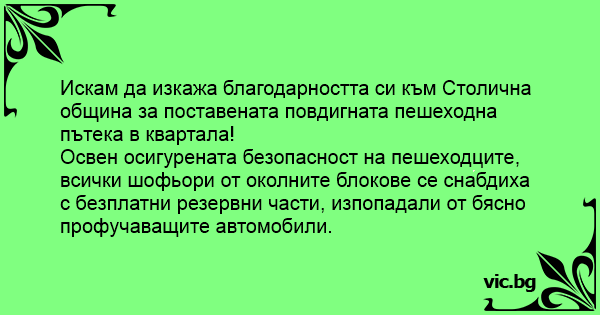 Искам да изкажа благодарността си към Столична община за поставената повдигната пешеходна пътека в квартала!