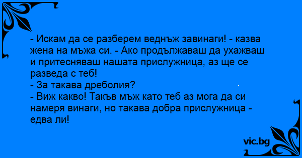 - Искам да се разберем веднъж завинаги! - казва жена на мъжа си. - Ако продължаваш да ухажваш и притесняваш нашата прислужница, аз ще се разведа с теб!