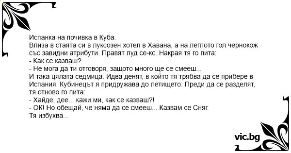 - Не, не се смея на името ти. Мисля си за физиономията, която ще направи мъжа ми, като се върна с тоя тен и му кажа, че цяла седмица в Куба съм била с 35 см. сняг...!