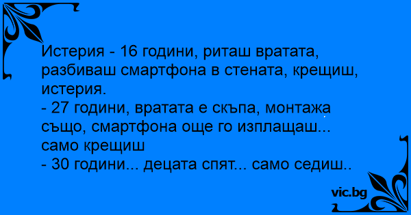Истерия - 16 години, риташ вратата, разбиваш смартфона в стената, крещиш, истерия.