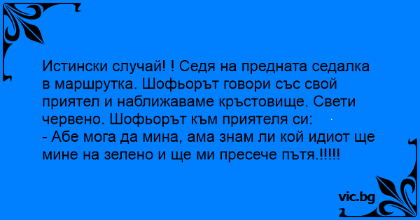 Истински случай! ! Седя на предната седалка в маршрутка. Шофьорът говори със свой приятел и наближаваме кръстовище. Свети червено. Шофьорът към приятеля си: