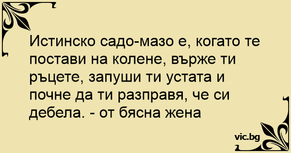Истинско садо-мазо е, когато те постави на колене, върже ти ръцете, запуши ти устата и почне да ти разправя, че си дебела. - от бясна жена