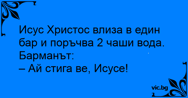 Исус Христос влиза в един бар и поръчва 2 чаши вода.