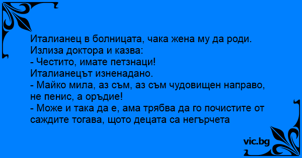 Италианец в болницата, чака жена му да роди. Излиза доктора и казва: