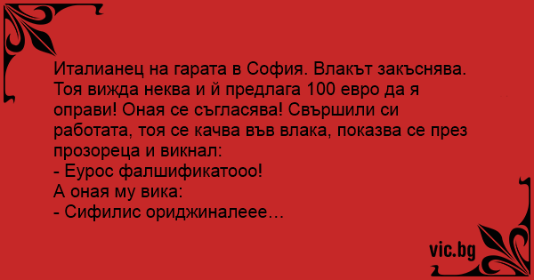 Италианец на гарата в София. Влакът закъснява. Тоя вижда неква и й предлага 100 евро да я оправи! Оная се съгласява! Свършили си работата, тоя се качва във влака, показва се през прозореца и викнал: - Еурос фалшификатооо! А оная му вика: - Сифилис ориджиналеее…