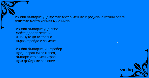 Их бин българче унд крефте мутер мен ме е родила, с готини блага гешефте мойта хаймат ми е мила.