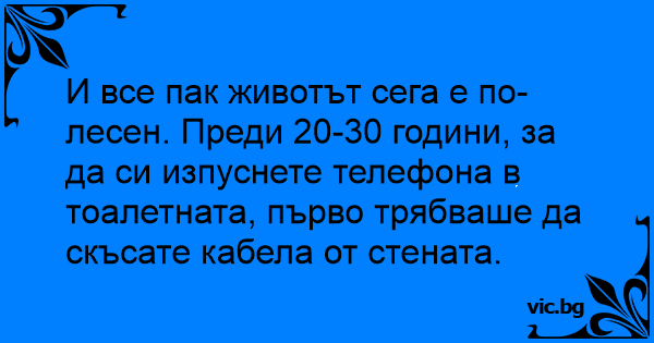 И все пак животът сега е по-лесен. Преди 20-30 години, за да си изпуснете телефона в тоалетната, първо трябваше да скъсате кабела от стената.
