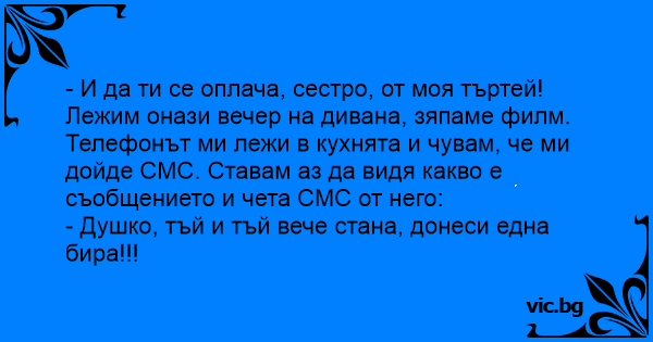 - И да ти се оплача, сестро, от моя търтей! Лежим онази вечер на дивана, зяпаме филм. Телефонът ми лежи в кухнята и чувам, че ми дойде СМС. Ставам аз да видя какво е съобщението и чета СМС от него: