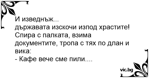 държавата изскочи изпод храстите! Спира с палката, взима документите, тропа с тях по длан и вика: