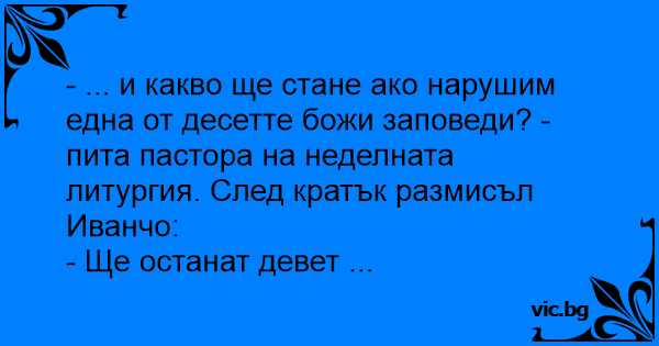 - ... и какво ще стане ако нарушим една от десетте божи заповеди? - пита пастора на неделната литургия. След кратък размисъл Иванчо: