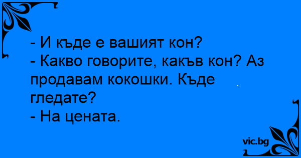 - Какво говорите, какъв кон? Аз продавам кокошки. Къде гледате?