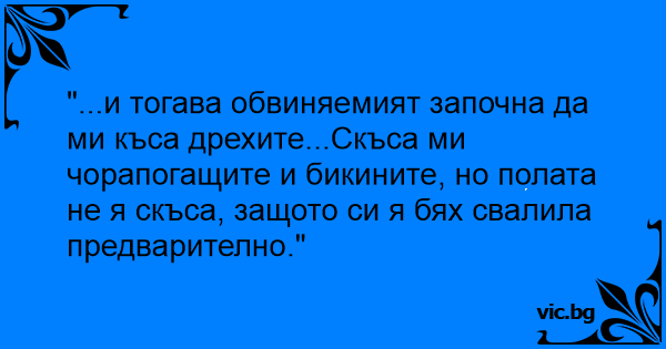 "...и тогава обвиняемият започна да ми къса дрехите...Скъса ми чорапогащите и бикините, но полата не я скъса, защото си я бях свалила предварително."