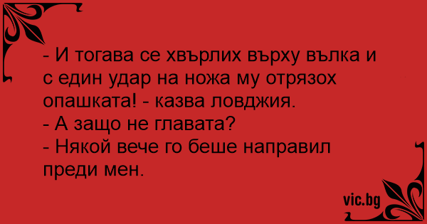 - И тогава се хвърлих върху вълка и с един удар на ножа му отрязох опашката! - казва ловджия.