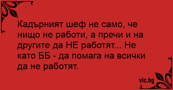 Кадърният шеф не само, че нищо не работи, а пречи и на другите да НЕ работят... Не като ББ - да помага на всички да не работят.