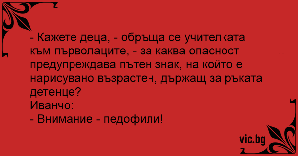 - Кажете деца, - обръща се учителката към първолаците, - за каква опасност предупреждава пътен знак, на който е нарисувано възрастен, държащ за ръката детенце?