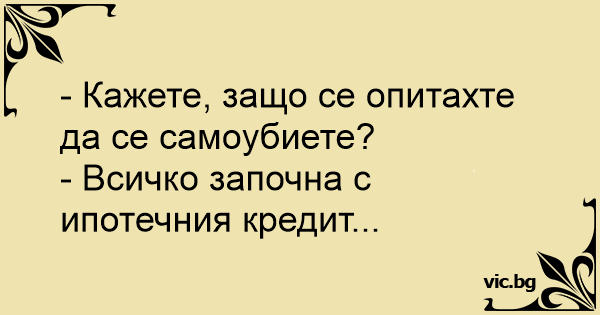 - Кажете, защо се опитахте да се самоубиете?<br />- Всичко започна с ипотечния кредит...