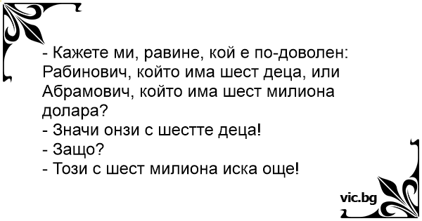 - Кажете ми, равине, кой е по-доволен: Рабинович, който има шест деца, или Абрамович, който има шест милиона долара?