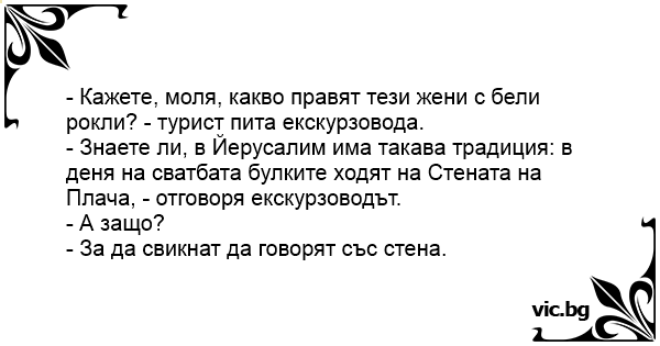 - Знаете ли, в Йерусалим има такава традиция: в деня на сватбата булките ходят на Стената на Плача, - отговоря екскурзоводът.