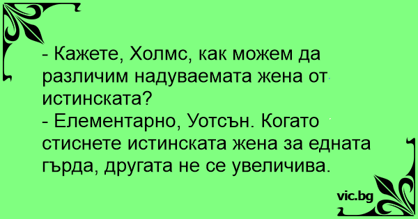 - Елементарно, Уотсън. Когато стиснете истинската жена за едната гърда, другата не се увеличива.