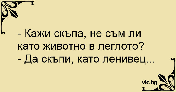 - Кажи скъпа, не съм ли като животно в леглото? - Да скъпи, като ленивец... English Deutsch Español Русский Français Italiano Ελληνικά Македонски Türkçe Українська Português Polski Svenska Nederlands Dansk Norsk Suomi Magyar Româna Čeština Lietuvių Latviešu Hrvatski