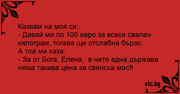 - Давай ми по 100 евро за всеки свален килограм, тогава ще отслабна бързо.