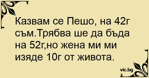 Казвам се Пешо, на 42г съм.Трябва ше да бъда на 52г,но жена ми ми изяде 10г от живота.
