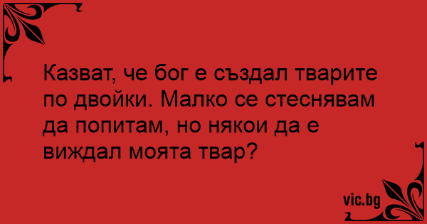 Казват, че бог е създал тварите по двойки. Малко се стеснявам да попитам, но някои да е виждал моята твар?