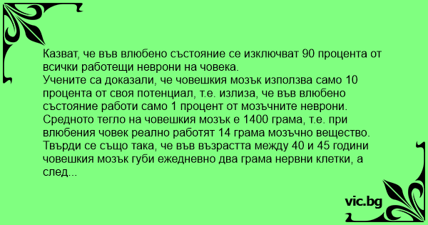 Учените са доказали, че човешкия мозък използва само 10 процента от своя потенциал, т.е. излиза, че във влюбено състояние работи само 1 процент от мозъчните неврони. Средното тегло на човешкия мозък е 1400 грама, т.е. при влюбения човек реално работят 14 грама мозъчно вещество. Твърди се също така, че във възрастта между 40 и 45 години човешкия мозък губи ежедневно два грама нервни клетки, а след 50 години - по три грама годишно.