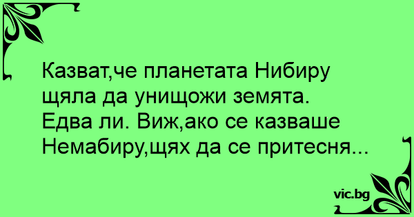 Казват,че планетата Нибиру щяла да унищожи земята. Едва ли. Виж,ако се казваше Немабиру,щях да се притесня...