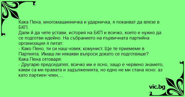 - Како Пено, ти си наш човек, комунист. Ще те приемеме в Партията. Имаш ли някакви въпроси докато се подготвяше?