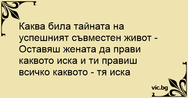 Каква била тайната на успешният съвместен живот - Оставяш жената да прави каквото иска и ти правиш всичко каквото - тя иска