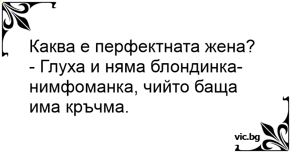 - Хто така ідеальна жінка? - Гарна глухоніма білявка-німфоманка, у якої з батьків залишився тільки батько-банкір.