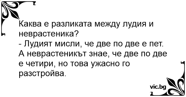 - Лудият мисли, че две по две е пет. А неврастеникът знае, че две по две е четири, но това ужасно го разстройва.