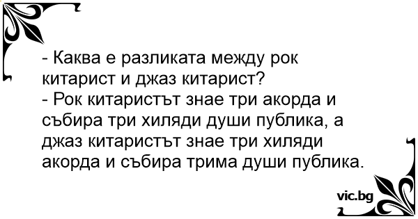 - Рок китаристът знае три акорда и събира три хиляди души публика, а джаз китаристът знае три хиляди акорда и събира трима души публика.