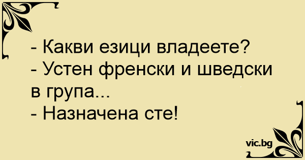 - Какви езици владеете?- Устен френски и шведски в група...- Назначена сте! 8 0 0 Мръсни и неприлични вицове, 18+