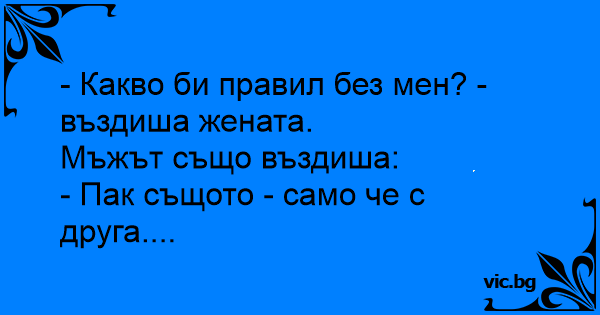 - Какво би правил без мен? - въздиша жената.Мъжът също въздиша:- Пак същото - само че с друга.... 2 0 0 Български Вицове