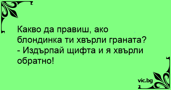 - Vad gör du om en blondin kastar en granat mot dig? - Drar ur säkringen och kastar tillbaka den.