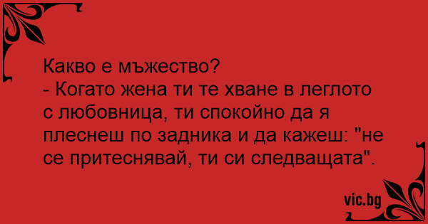 Care este culmea bărbăţiei? Când eşti prins de soţie cu amanta în pat, o mângâi uşor pe cap, spunându-i: Următoarea eşti tu!