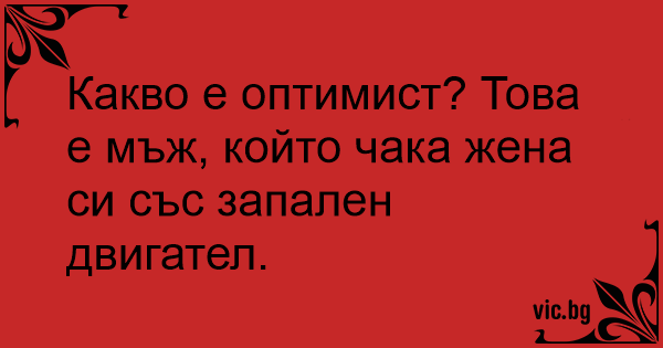 Какво е оптимист? Това е мъж, който чака жена си със запален двигател.