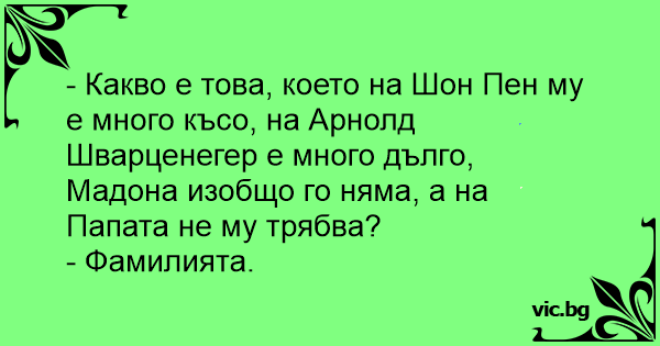 - Какво е това, което на Шон Пен му е много късо, на Арнолд Шварценегер е много дълго, Мадона изобщо го няма, а на Папата не му трябва?
